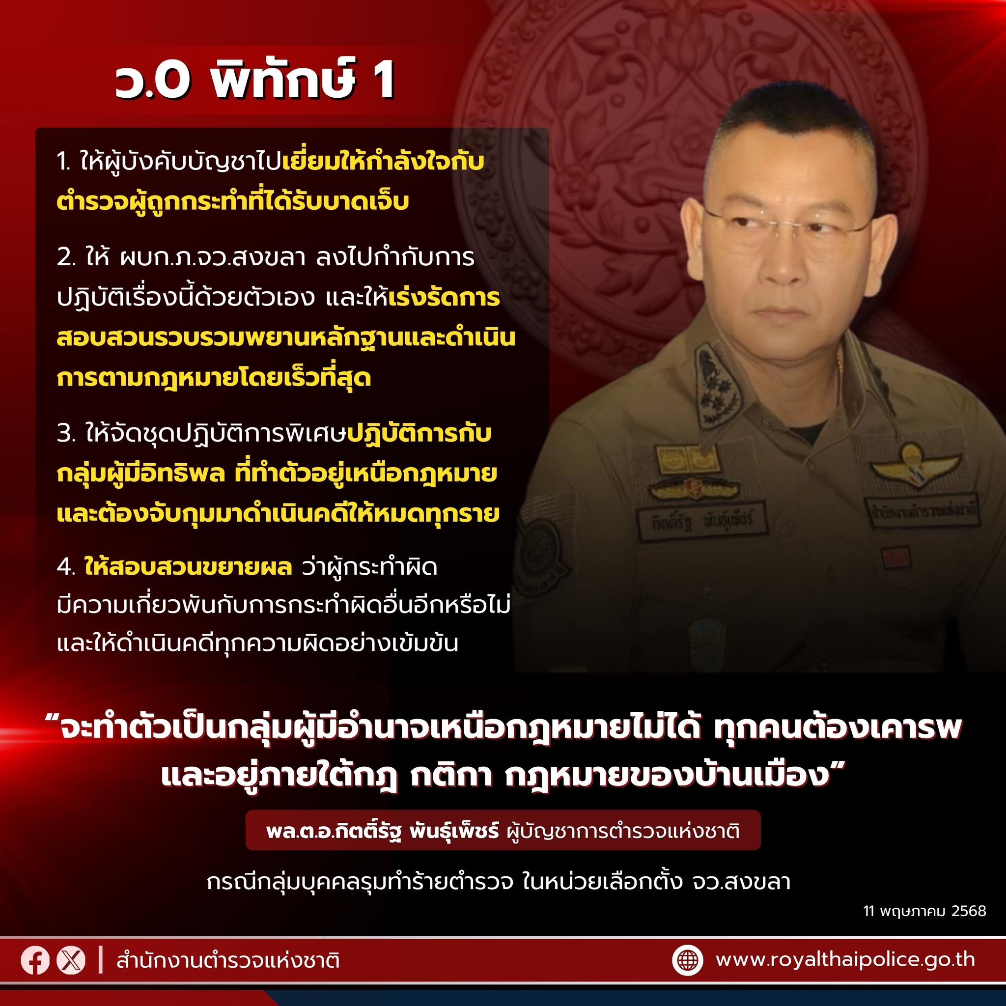 ว.0 พิทักษ์ 1 ข้อสั่งการ ผบ.ตร. ให้ดำเนินการตามกฎหมายอย่างรวดเร็ว เด็ดขาด กับกลุ่มคนที่ทำร้ายตำรวจใน