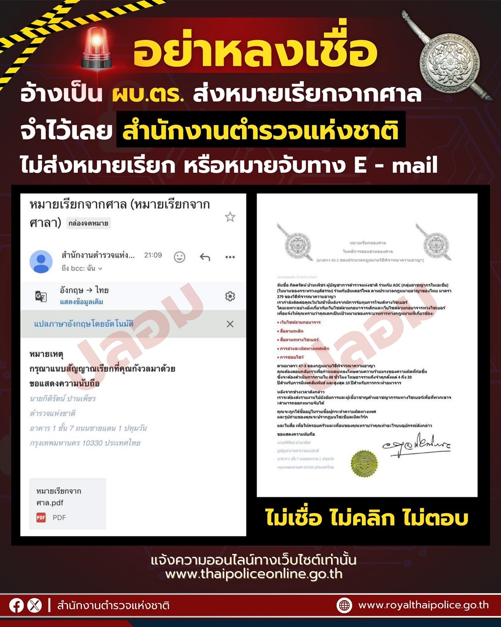 🚨อย่าหลงเชื่อ⚠️อ้างเป็น ผบ.ตร. ส่งหมายเรียกจากศาลจำไว้เลย ‼️ สำนักงานตำรวจแห่งชาติ ไม่ส่งหมายเรียก ห