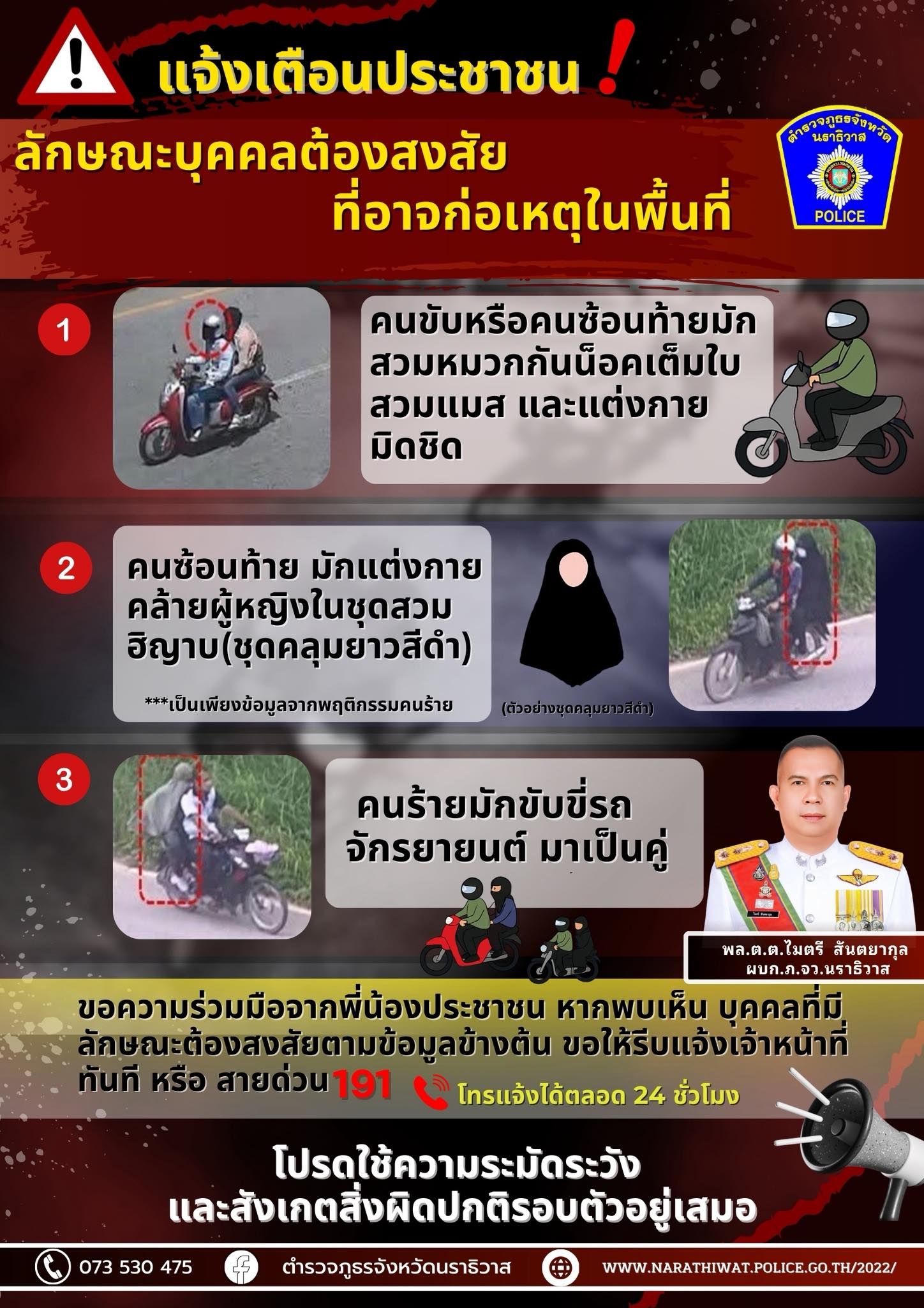 แจ้งเตือนประชาชน ตำรวจภูธรจังหวัดนราธิวาส ขอแจ้งเตือนพี่น้องประชาชนให้เพิ่มความระมัดระวังและเฝ้าระวั