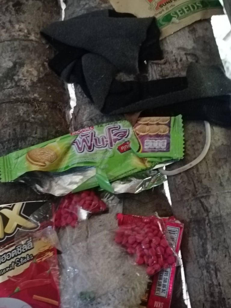 – พบยาเสพติดให้โทษประเภท 1 (ยาบ้า) จำนวน 111 เม็ด วางไว้ใต้ที่นอนในขนำข้างบ้าน
