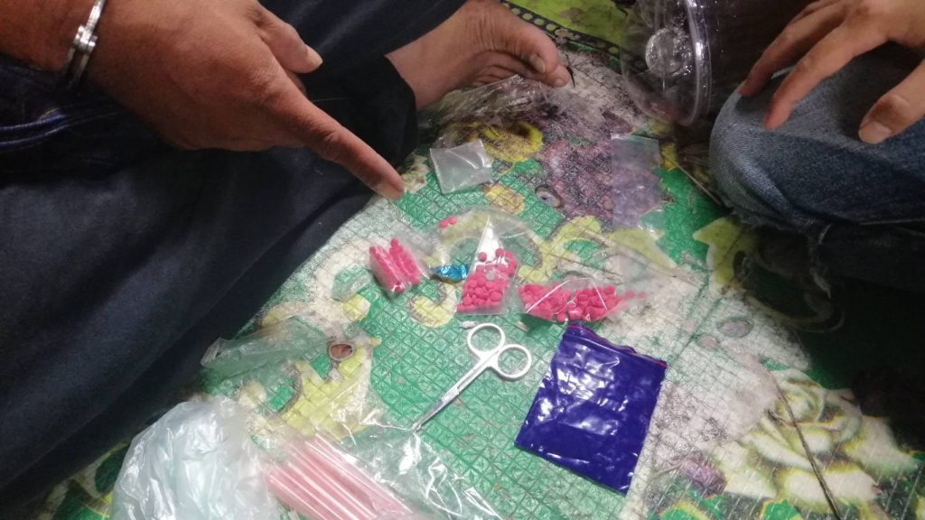 – ถุงที่ 1 บรรจุยาบ้า จำนวน 98 เม็ด(เม็ดสีแดง 97 เม็ด, เม็ดสีเขียว 1 เม็ด)