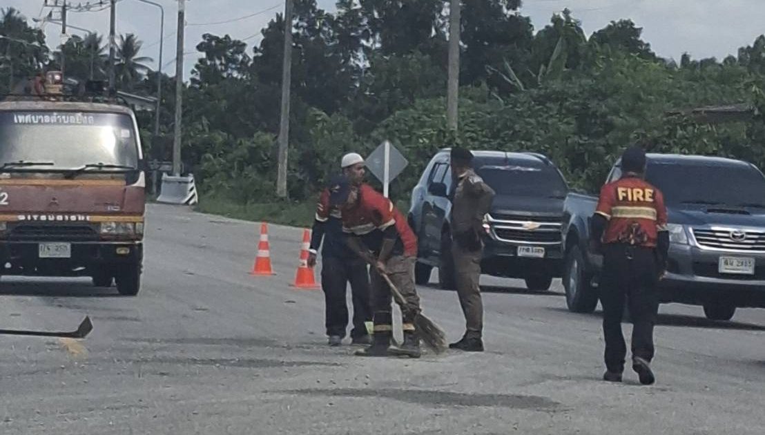 ข่ายจราจร ร่วม จนท. เทศบาลยี่งอ ว.4 ทำความสะอาดดิน หินตกหล่นถนนสาย 42 บริเวณที่กลับรถหลังตลาด
