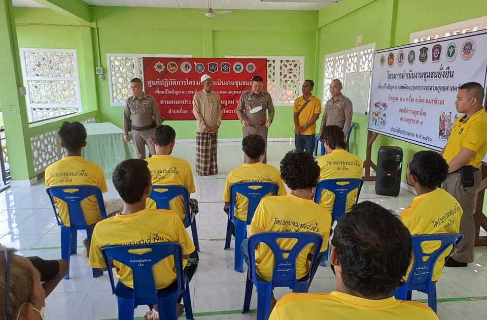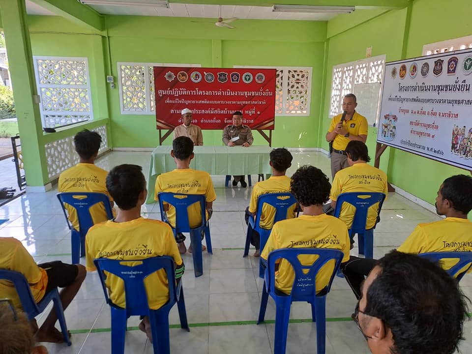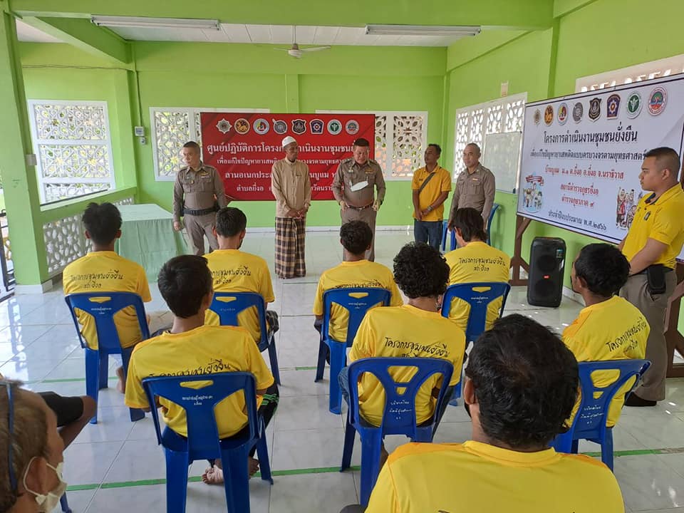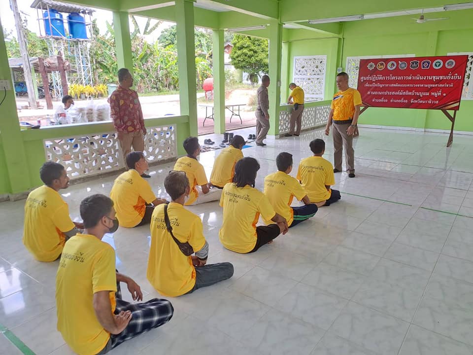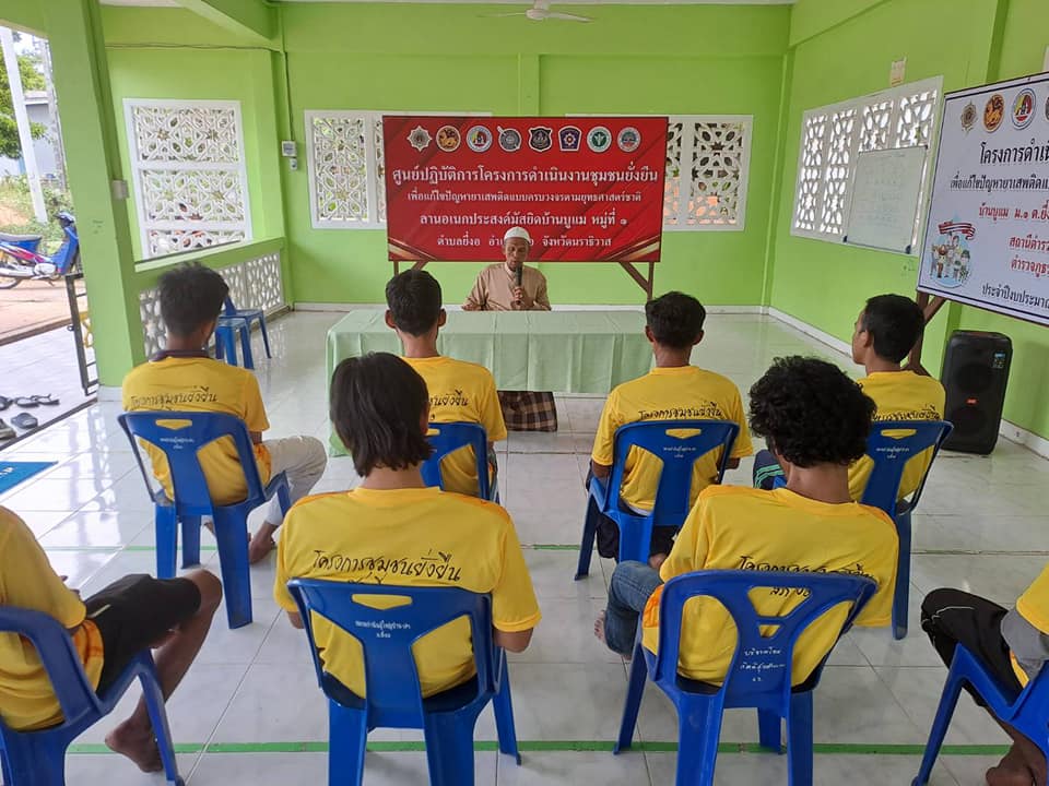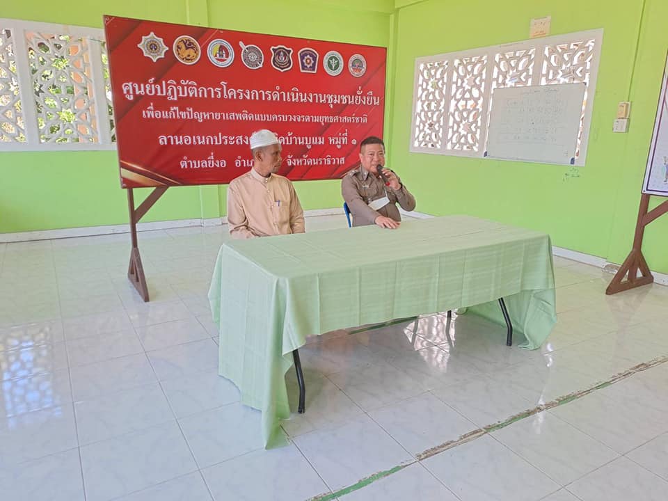 พ.ต.อ.วรงค์ เกิดสวัสดิ์ ผกก.สภ.ยี่งอ พ.ต.ท.สุเทพ จันทรมาส รอง ผกก ป.สภ.ยี่งอ ร.ต.ท.สัมฤทธิ์ จันทรประดิษฐ์ รอง สว(ป.)สภ.ยี่งอ ร.ต.ต.สาเหะสกันฎา บินหะมะ ร.ต.ต.รอสลี เจะยอ พร้อม ชุดตำรวจชุมชนสัมพันธ์ / ชป.ชุมชนยั่งยืนฯ สภ.ยี่งอ ร่วมกับผู้ใหญ่บ้าน ผู้นำชุมชน คณะกรรมการคุ้ม ทำการตรวจปัสสาวะ เพื่อหาสารเสพติด แก่ผู้เข้าร่วมโครงการ จำนวน 13 คน พร้อมบรรยายให้ความรู้เกี่ยวกับยาเสพติดแก่ผู้เข้าโครงการชุมชนยั่งยืนเพื่อแก้ปัญหายาเสพติดแบบครบวงจรตามยุทธศาสตร์ชาติ พ.ศ.2566 ในพื้นที่หมู่ที่บ้านบูแม ม.1 ต.ยี่งอ อ.ยี่งอ จ.นราธิวาส