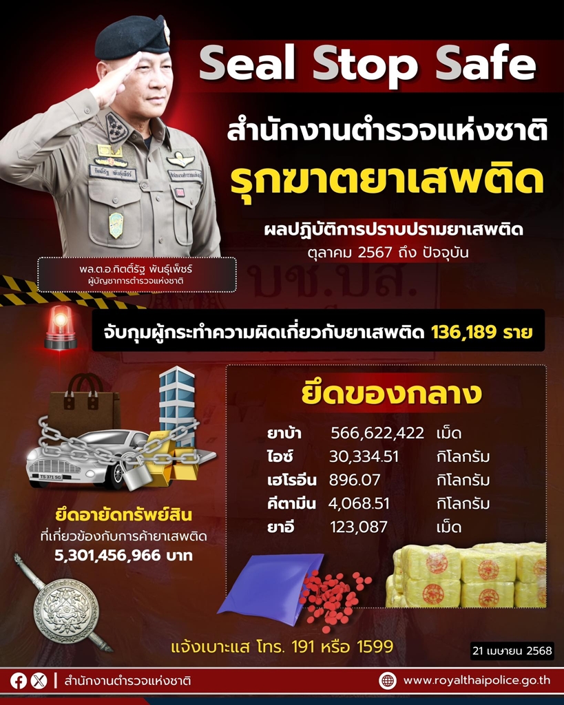 เดินหน้า Seal Stop Safe ปราบปรามยาเสพติดทุกมิติ สถิติผลการปฏิบัติงานด้านการปราบปรามยาเสพติดของสำนักง